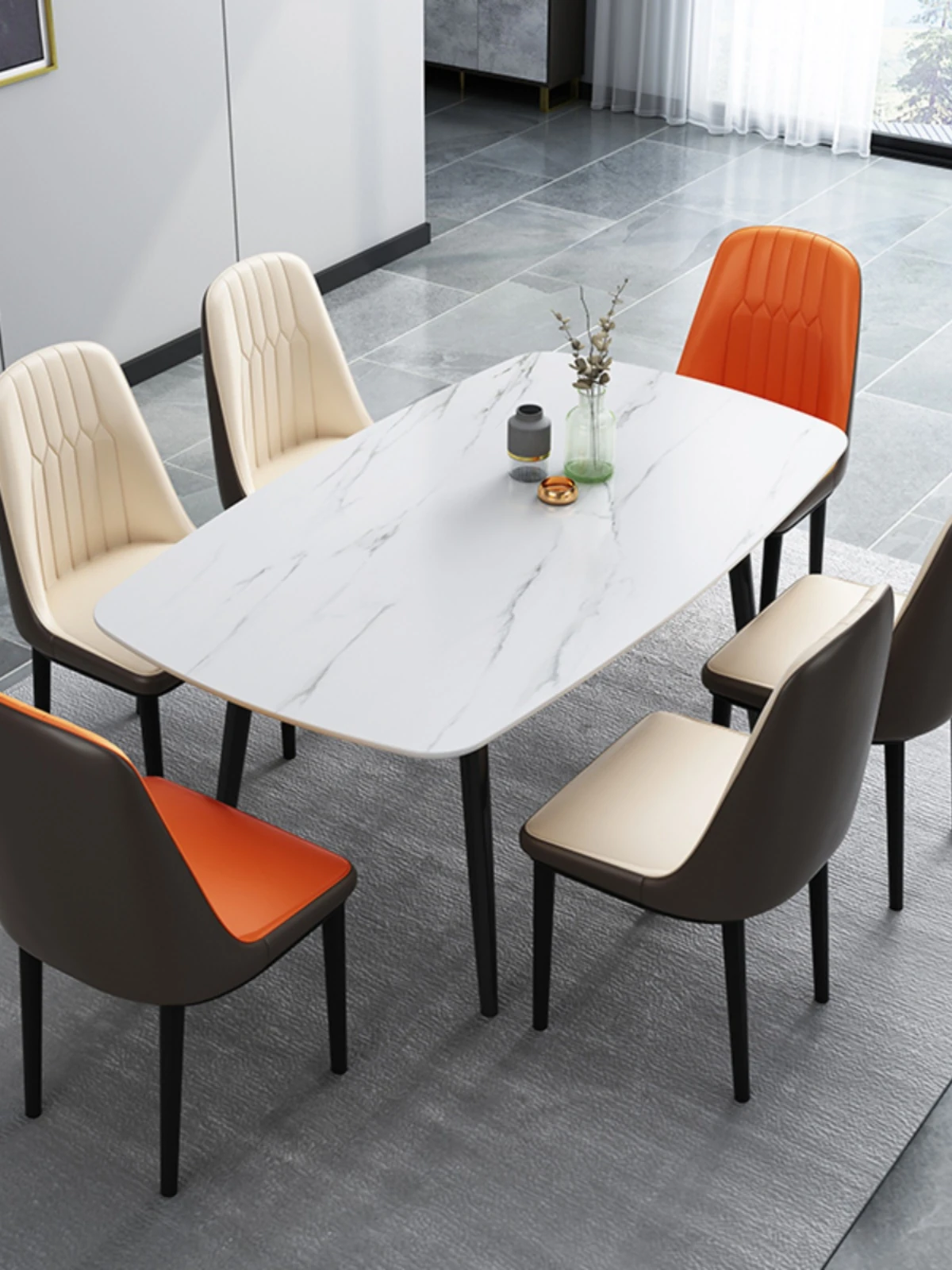モダンでシンプルな北欧スタイルの大理石チェアセット、コンパクトなアパートに最適な長方形の岩板ダイニングテーブル、頑丈な金属フレームでスタイリッシュな食卓を演出!
