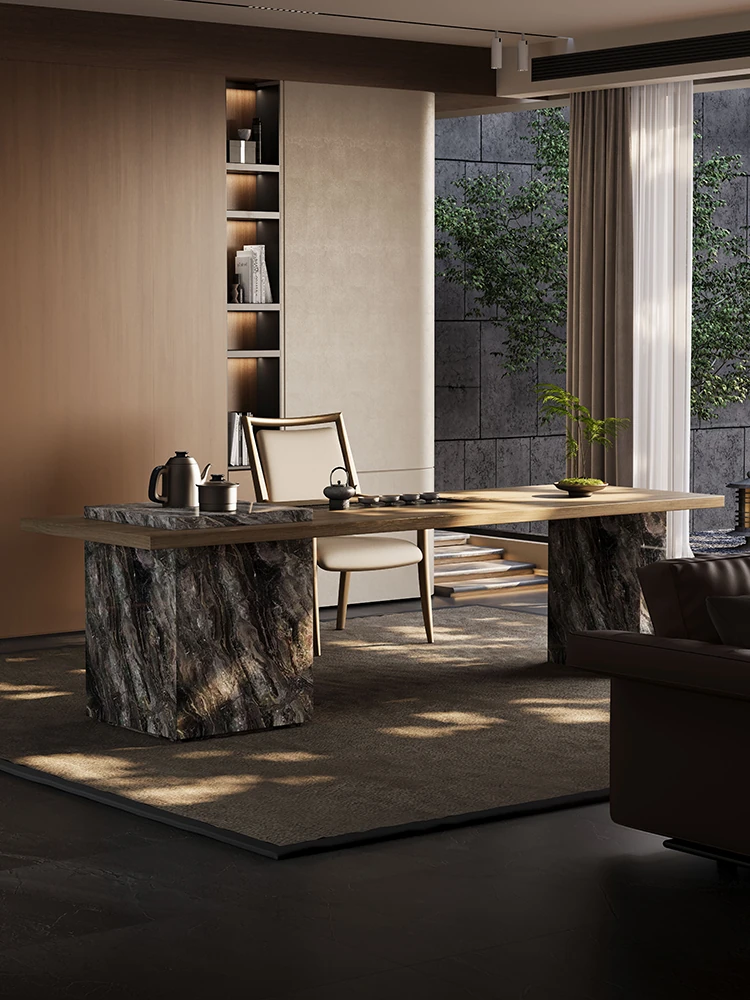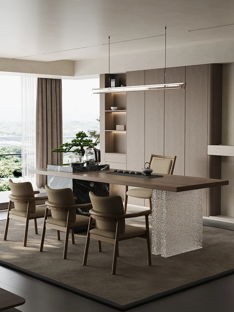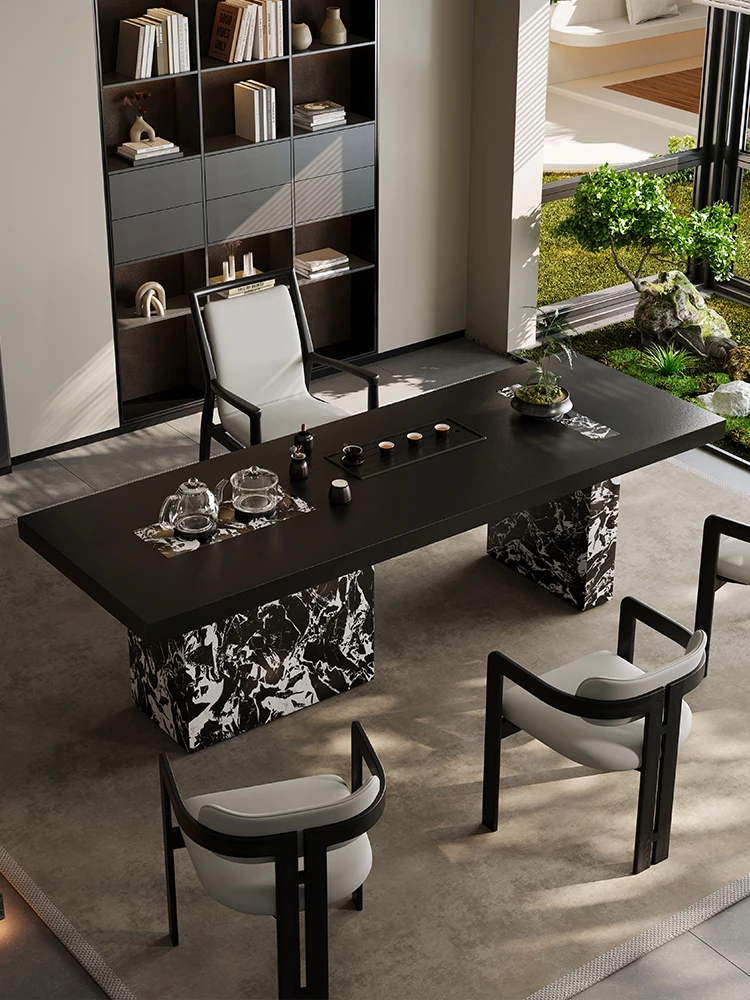 現代的シンプルな新中式ティーテーブル、ラグジュアリーな天然石を使用した茶台。広々とした平面別荘に最適で、スマート給水機能付きの収納ティーテーブル。優雅なひとときを演出します!